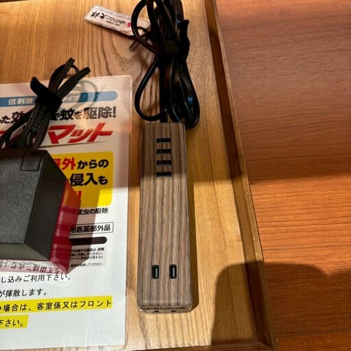 延長コードがありました。充電しながら枕元でスマホ見れるのでありがたい。