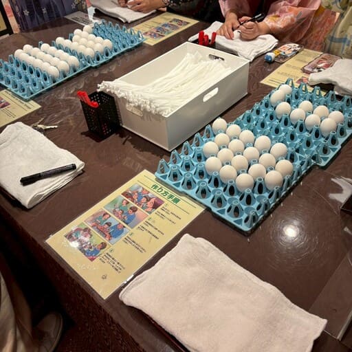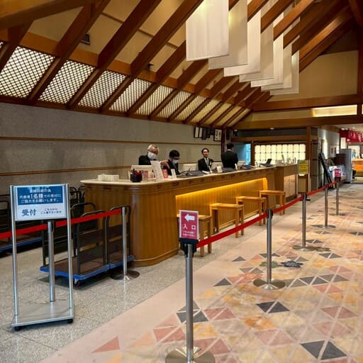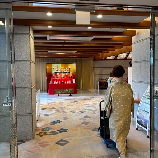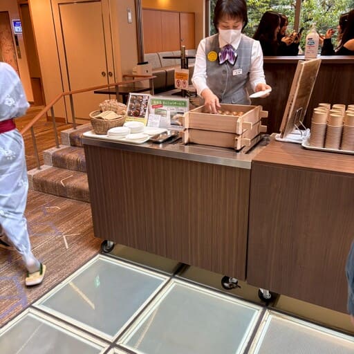 ロビーラウンジでのサービス(温泉卵や食べ物など)や、館内の案内をしながら。