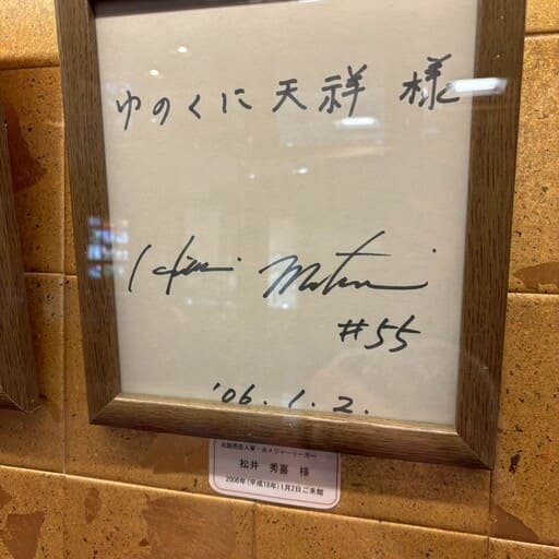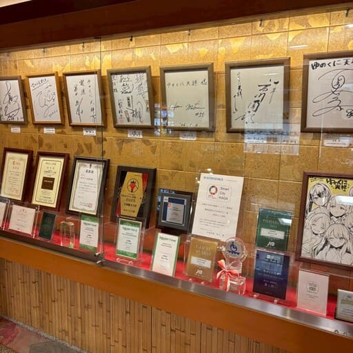 ロビーラウンジから大浴場までに、サインや受賞盾が飾ってありました。